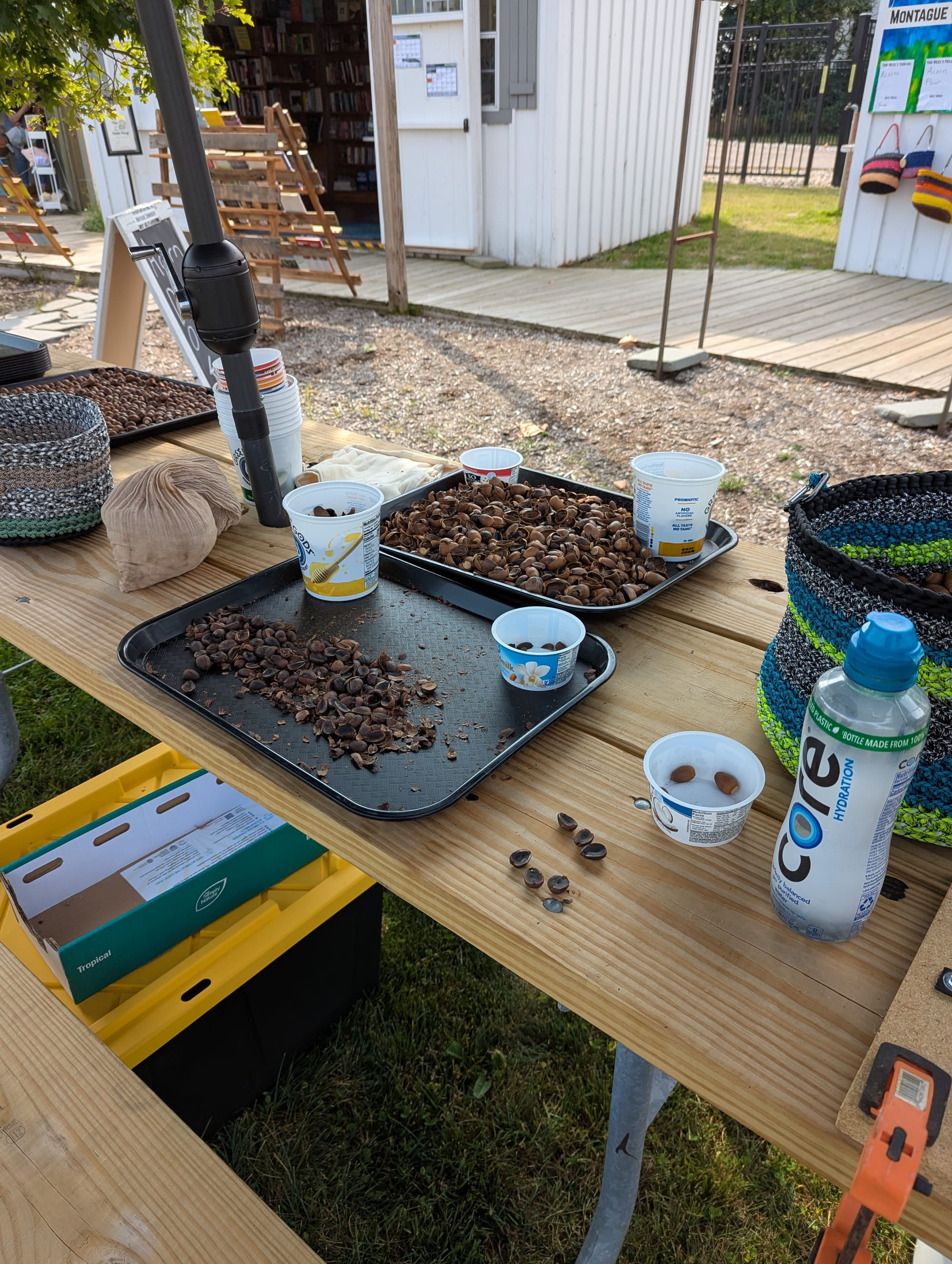 Our first day of acorn processing at the Artisan Market went quite well! We focused on the first few steps of the process, which were checking incoming nuts for signs of mold or weevils, cracking the shells of the dry nuts, and separating nutmeats from shells. We had four or five people drop off acorns, six or seven people sit down to help sort, and dozens more stop by to ask about how the process worked. We ended the day with about 8lbs of shelled nutmeats, which I'll be leaching the tannins out of this week so we can start grinding them into flour.