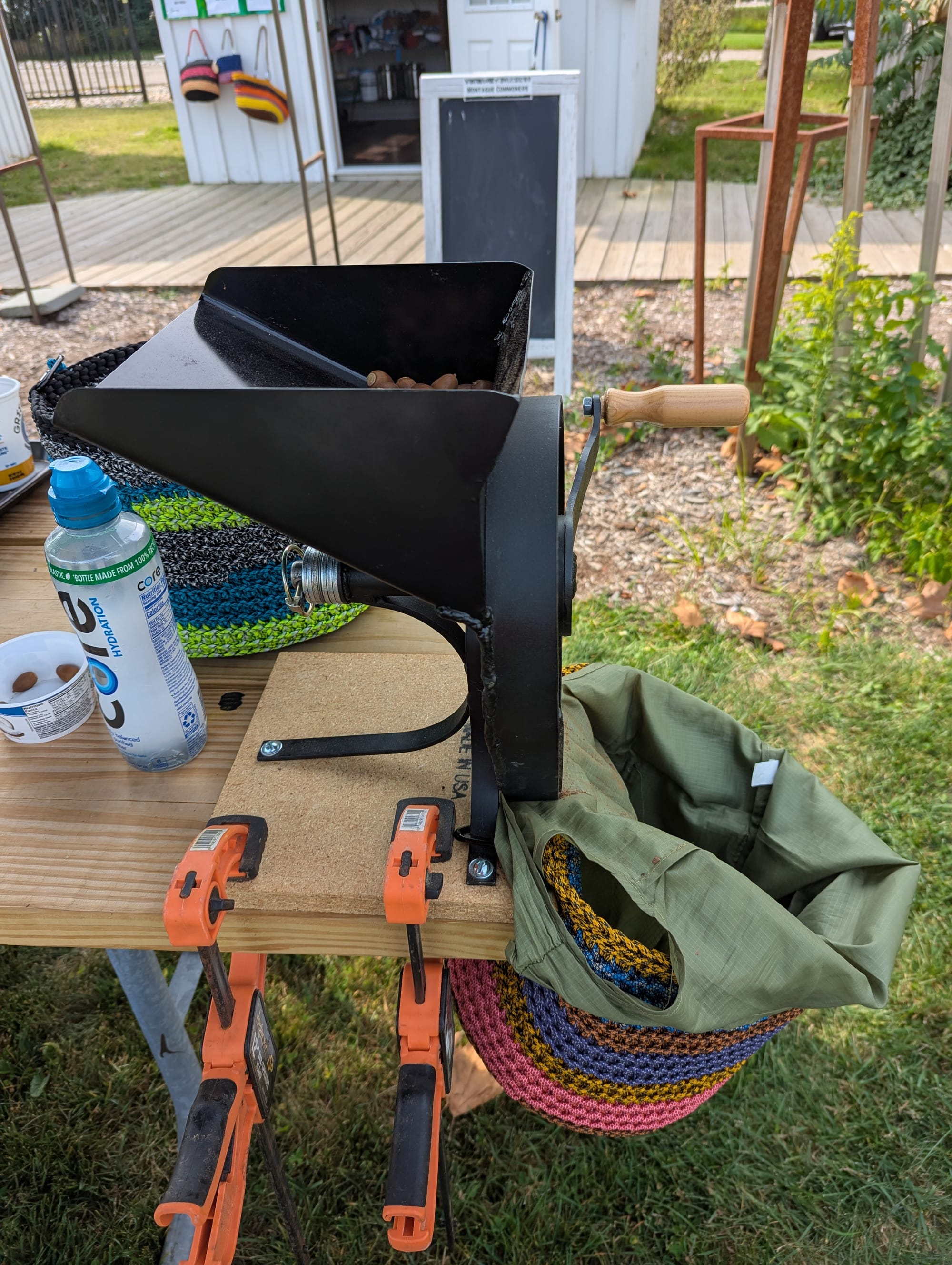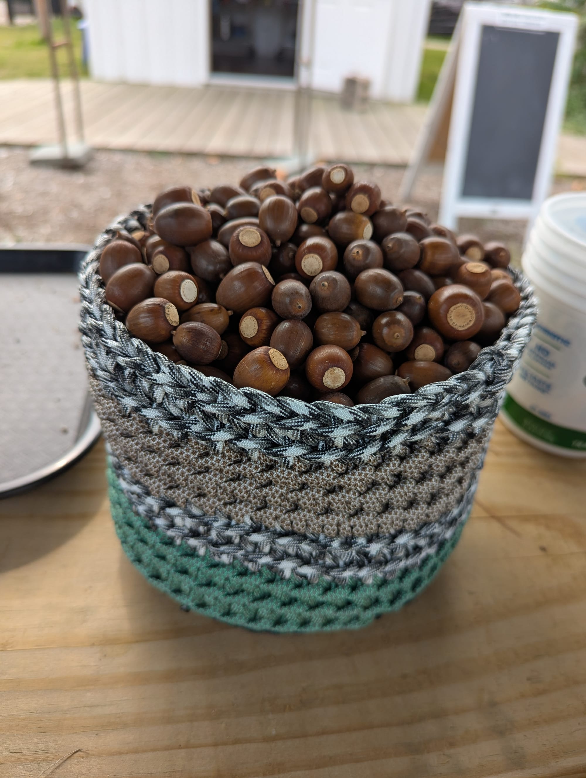 So far on the data front, I've figured out that I can gather about five pounds of fresh acorns in half an hour, and that they lose about a third of their weight as they're drying. I still need to figure out some numbers on how long it takes to sort shells from nutmeat, as well as what percentage of the dry acorn weight is nut vs. shell. I'm just aiming for ballpark numbers this year, since I don't have the brainspace right now for any kind of scientific rigor, but it would be nice to have a rough estimate of how much work goes into a cup of flour so that we can eventually offer acorn flour in exchange for hour tokens.