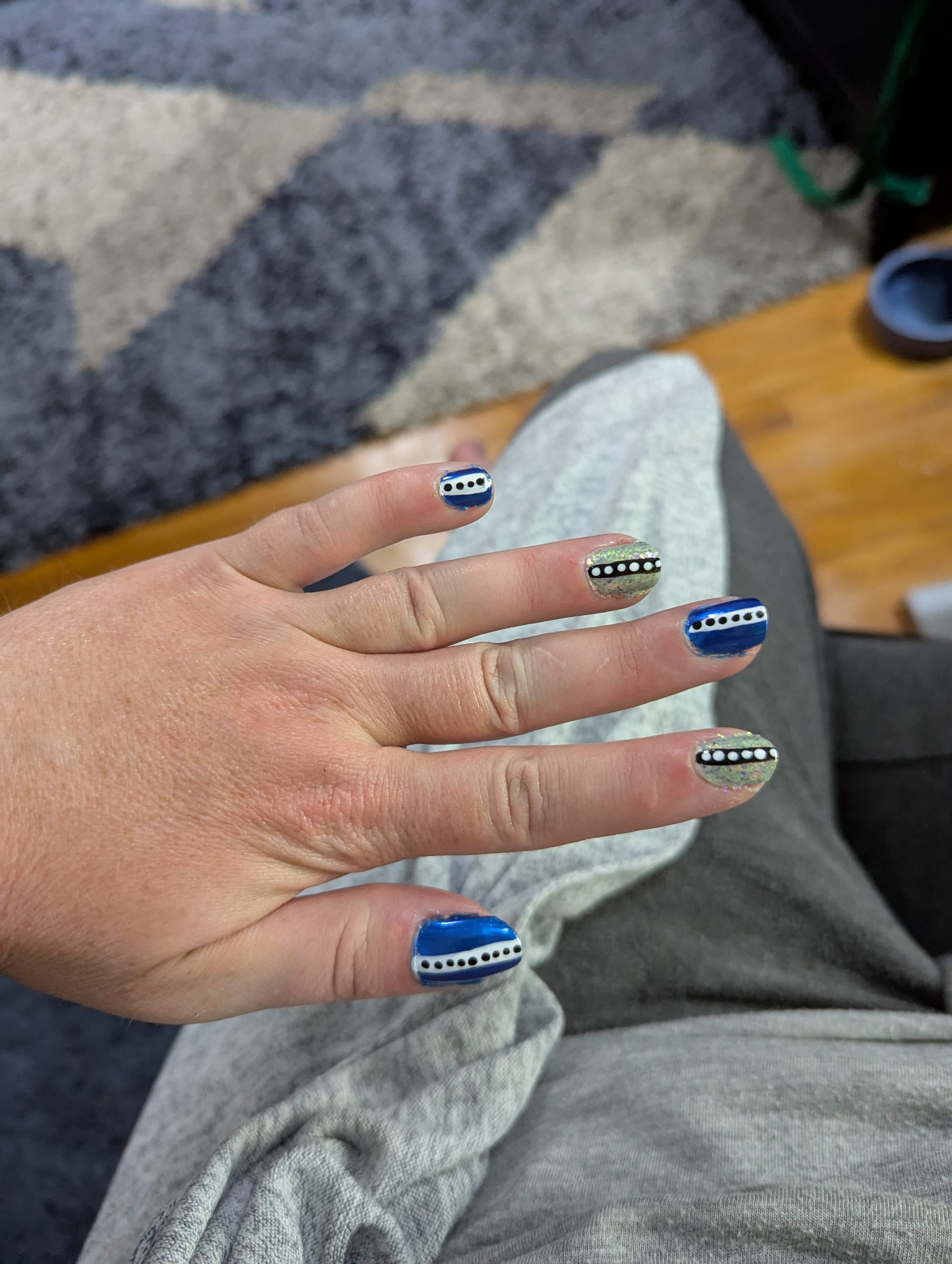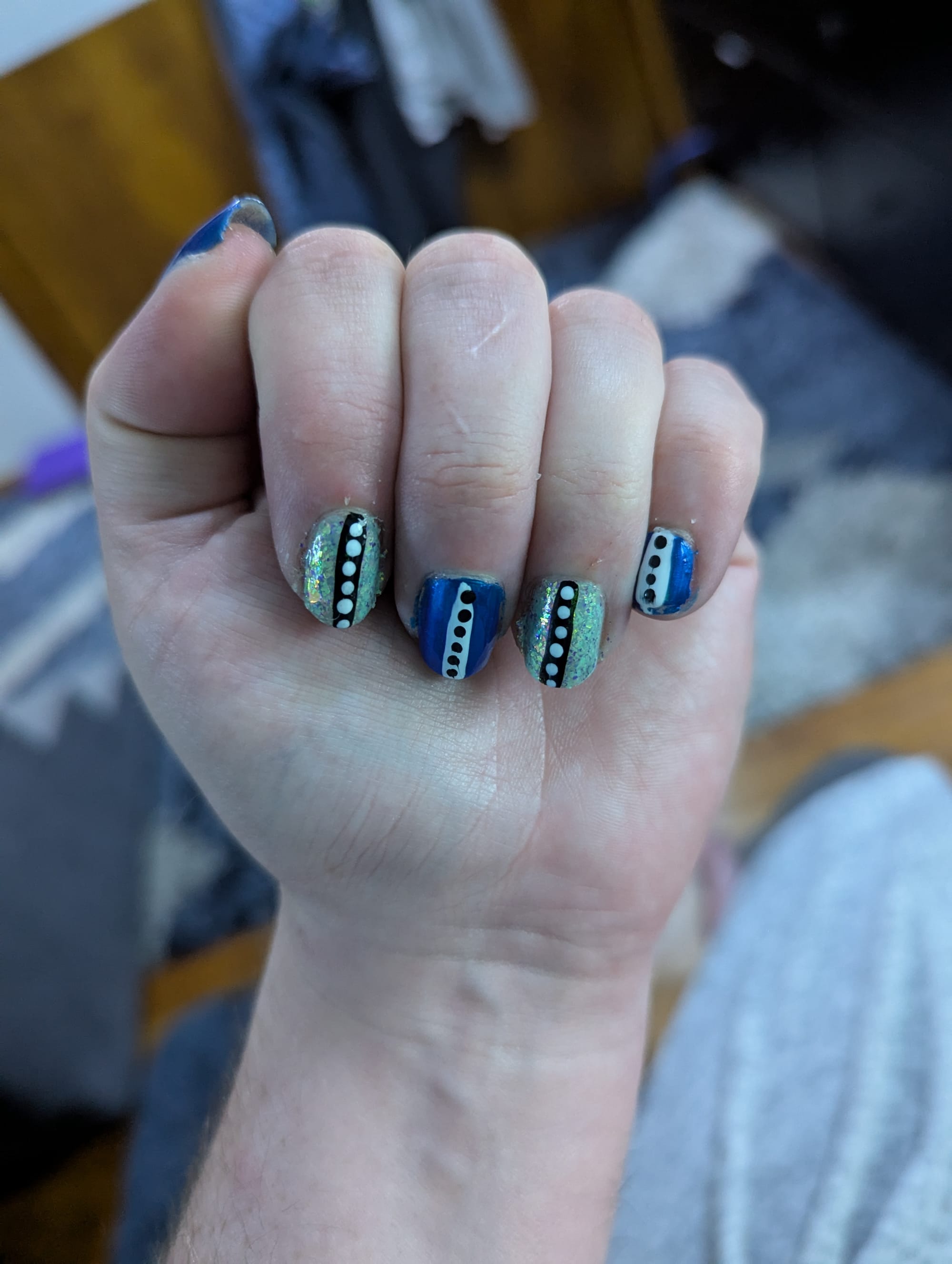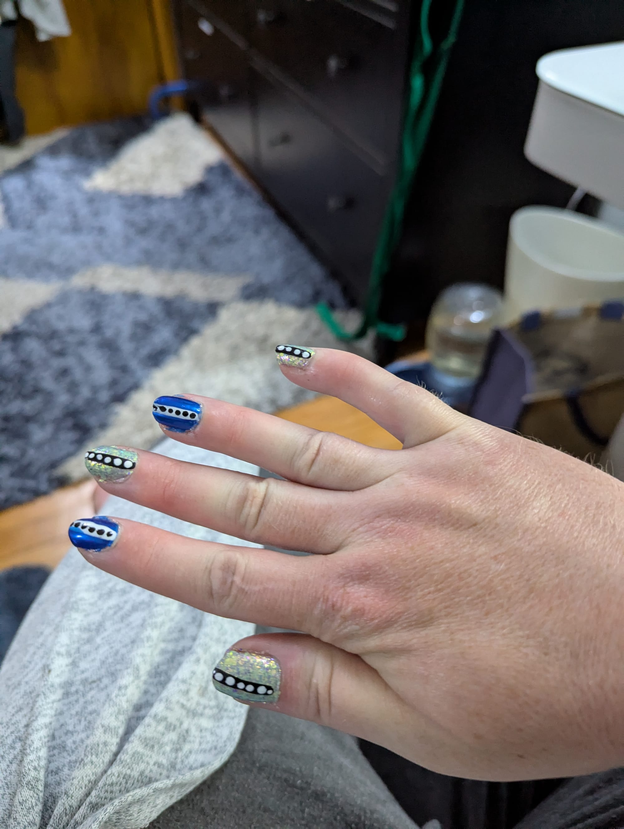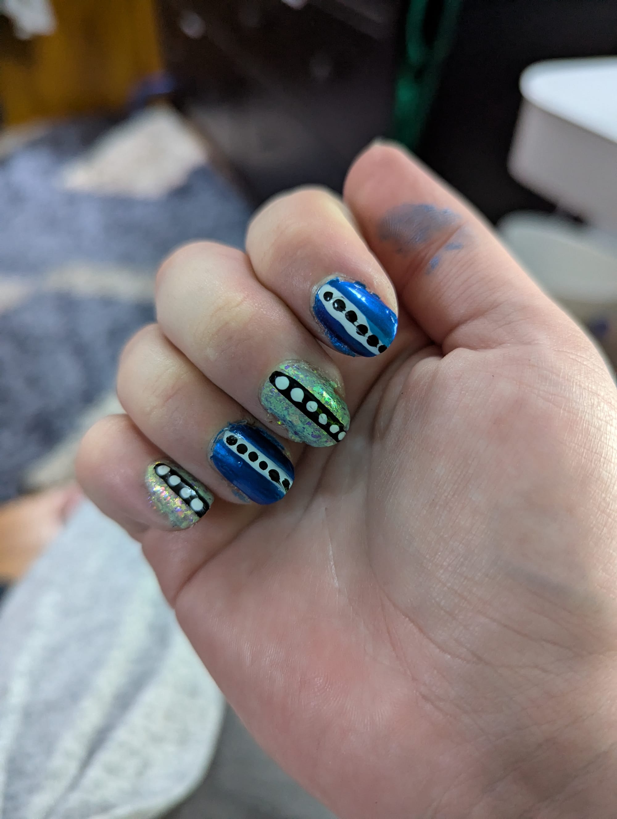 Thanks to Sue V for the medium blue polish! I wanted to give it a try, so I paired it with a light blue flakey polish to add some contrast. I rushed things a little bit with the top coat, and some of the dots got a little smudged, but I'm still happy with how it turned out.