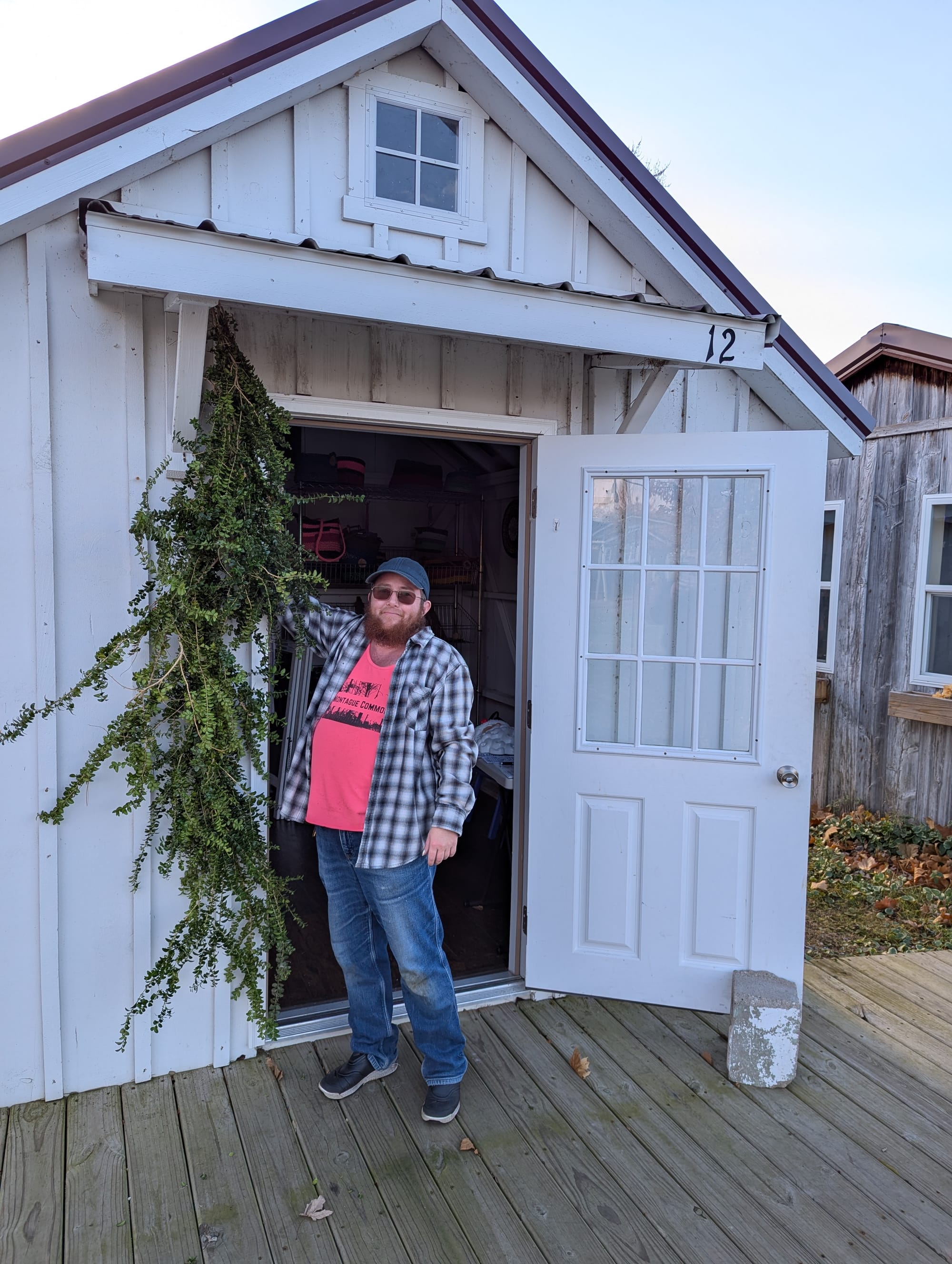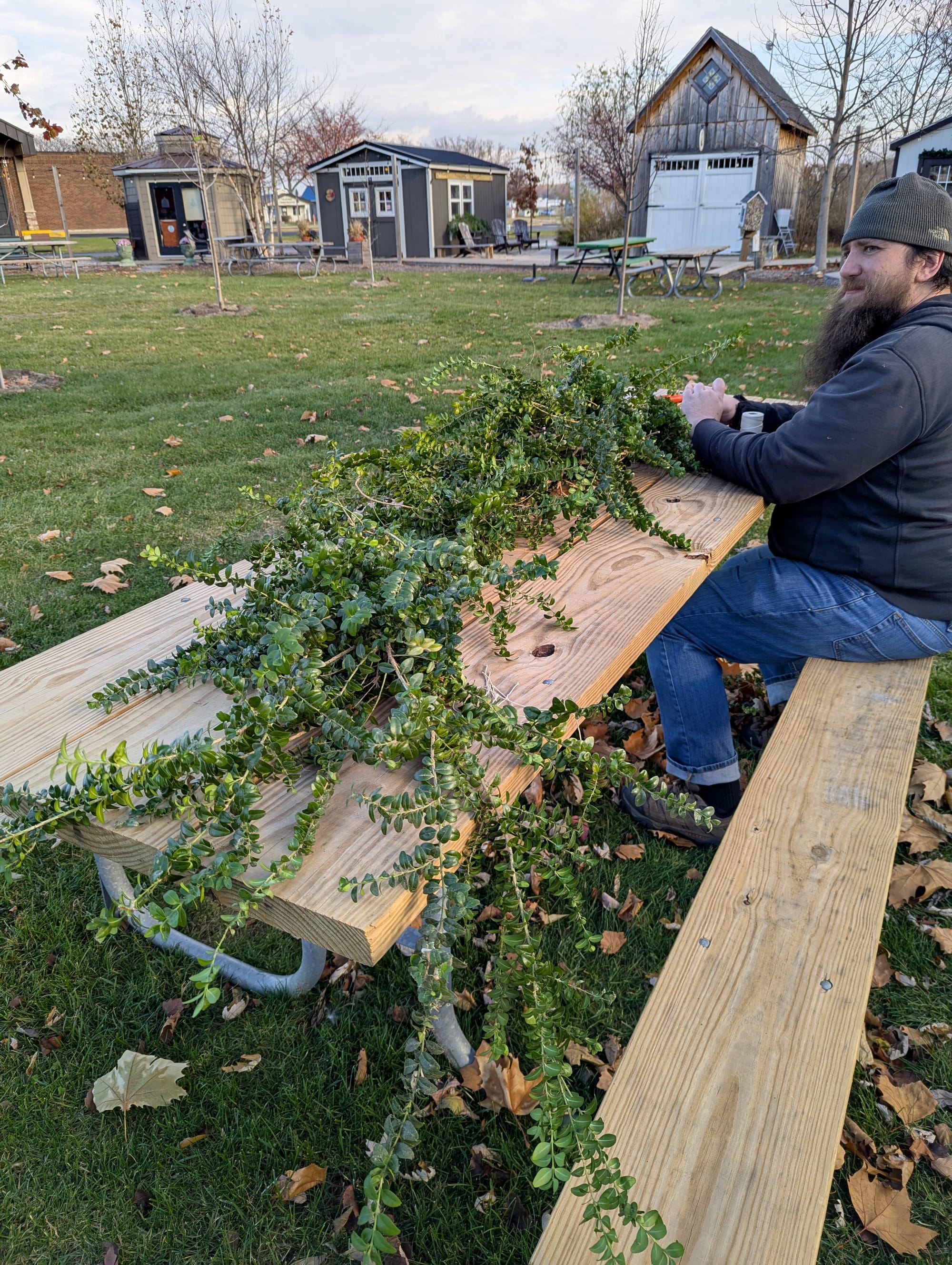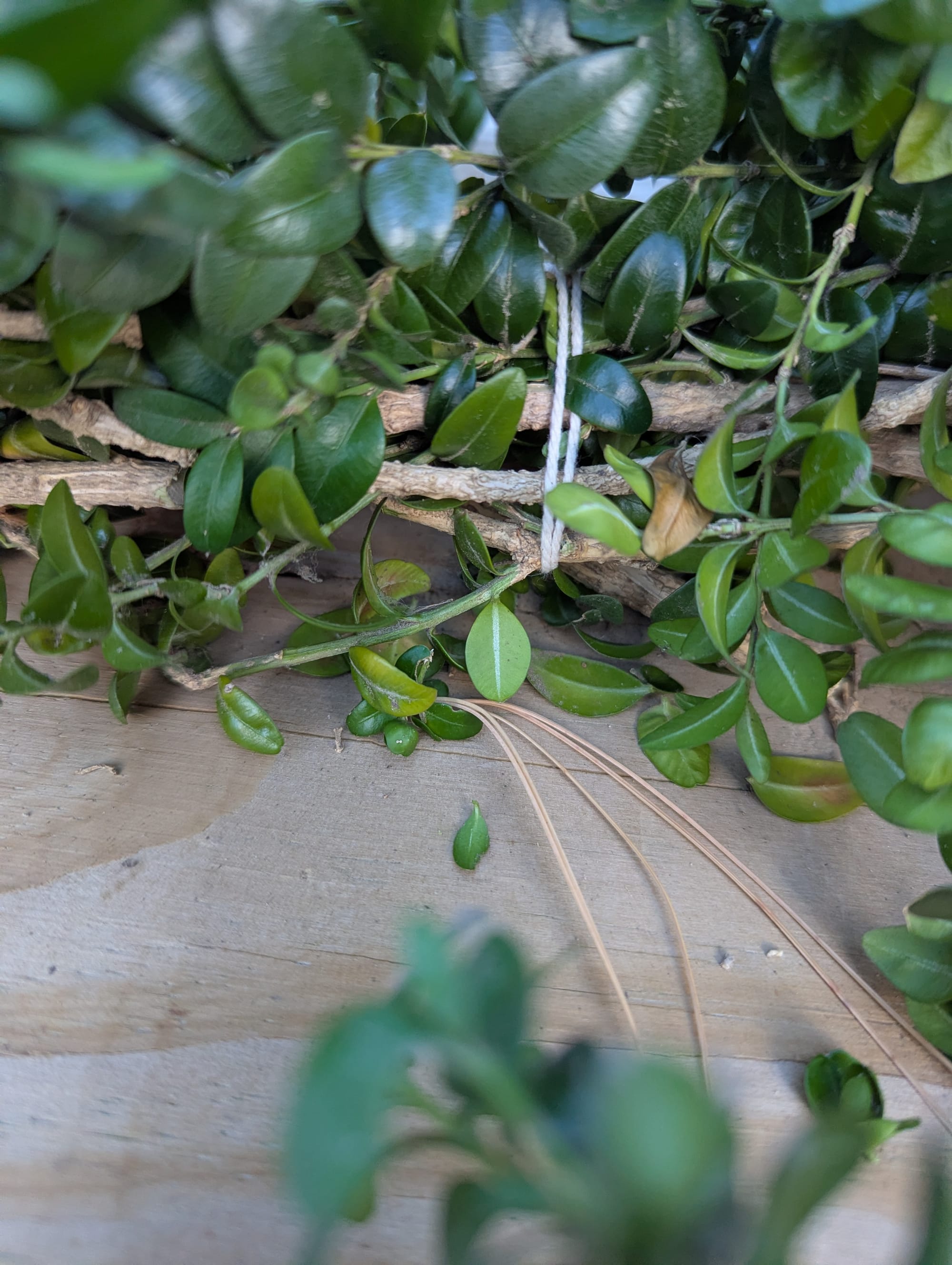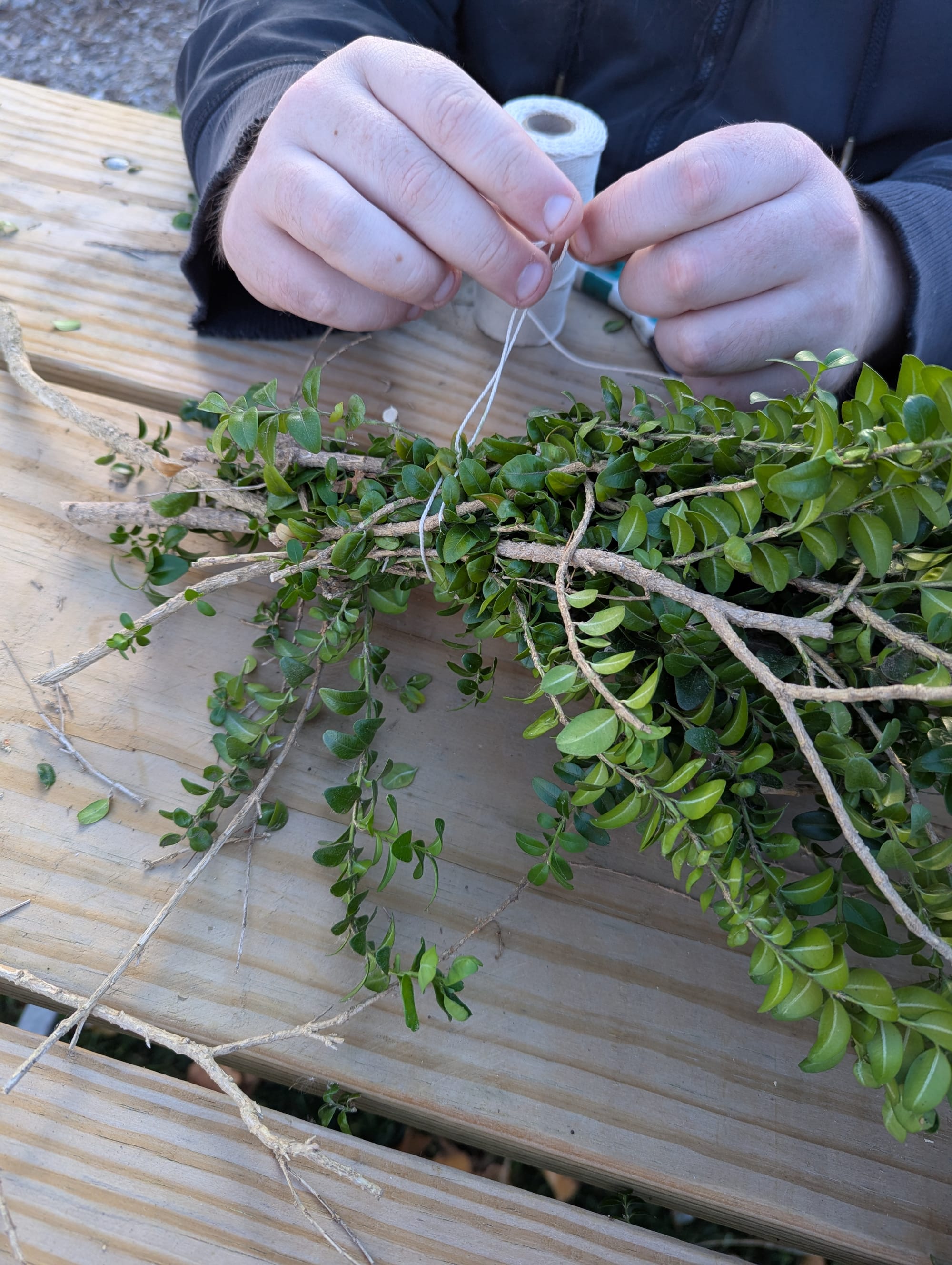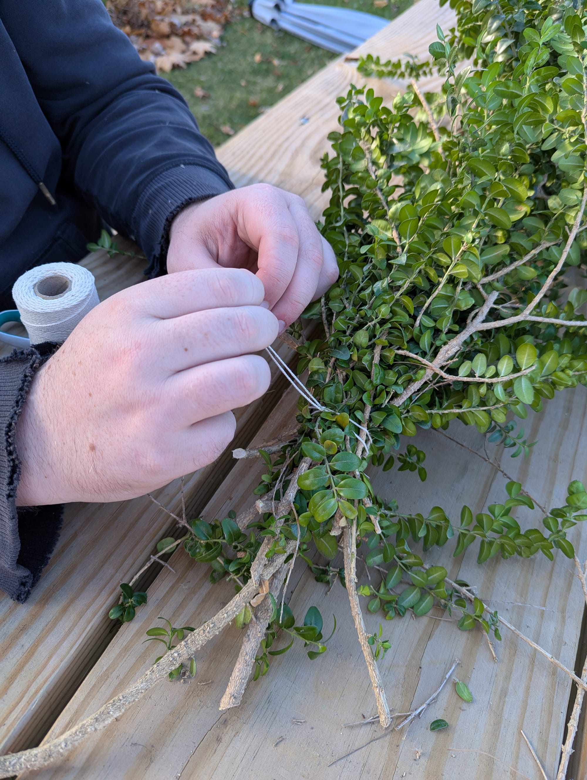 Nate and I got to sleep in on Saturday for the first time since the Artisan Market opened in May 😂 But it wasn't an entirely Market-free day. The Holiday Walk is coming up this weekend, and participants are required to decorate for the holidays. Since Nate and I aren't big holiday decorators, and we didn't want to buy a bunch of plastic we were only going to use for two days, we decided to try our hand at making a garland. I pruned some branches off an evergreen Box bush that was getting too close to the house, and we used trial and error to work out a method of staggering the branches and tying them together into a workable continuous "cord". We aren't going to be quitting our day jobs any time soon, but we were pleased with the way it turned out.