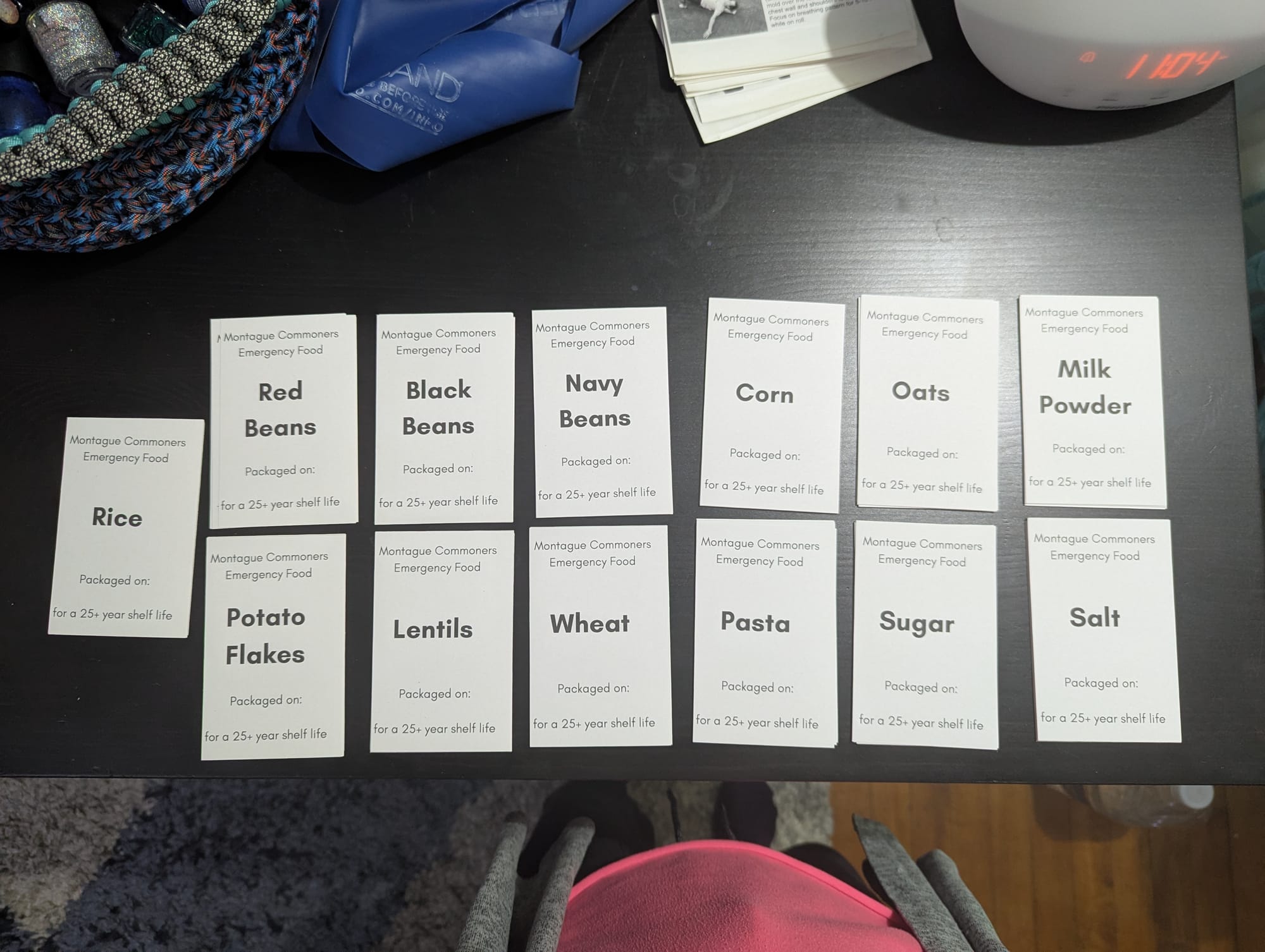 Now that I've got the contents of the food buckets figured out, I got started on making labels to go on the individual bags. My first few design attempts were trying to be visually engaging and fun, but in the end I decided that making the important information easy to find was more important in this case. So the labels are simple and a bit boring instead 😆 I do still have some blank circular labels that have been sitting around for 10+ years because they're hard to fit much information on, so I might use those to make some decorative/encouraging stickers that we can add to the bags to jazz them up.