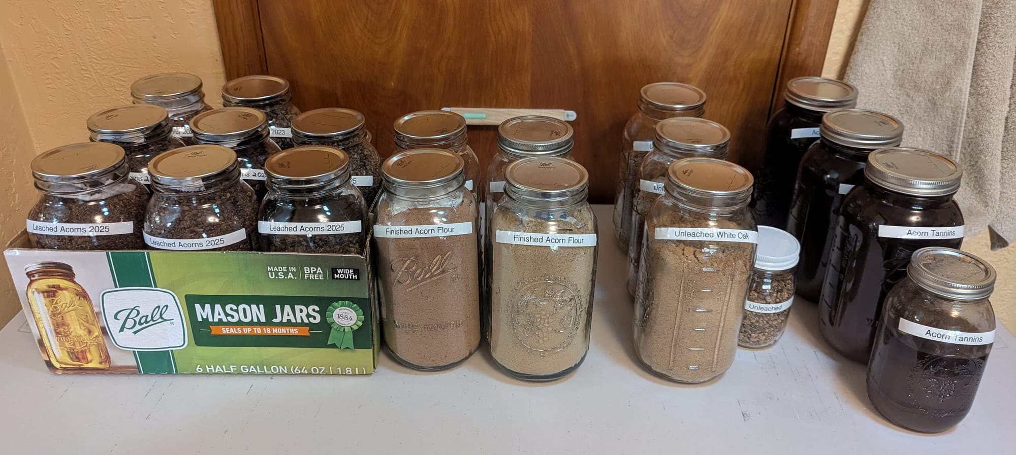 - ~4 gallons of un-ground leached acorns, which have been vacuum sealed with dessicant packs for maximum shelf life. They'll hang out in the pantry until we start getting low on flour, at which point I'll pull out the flour mill again.