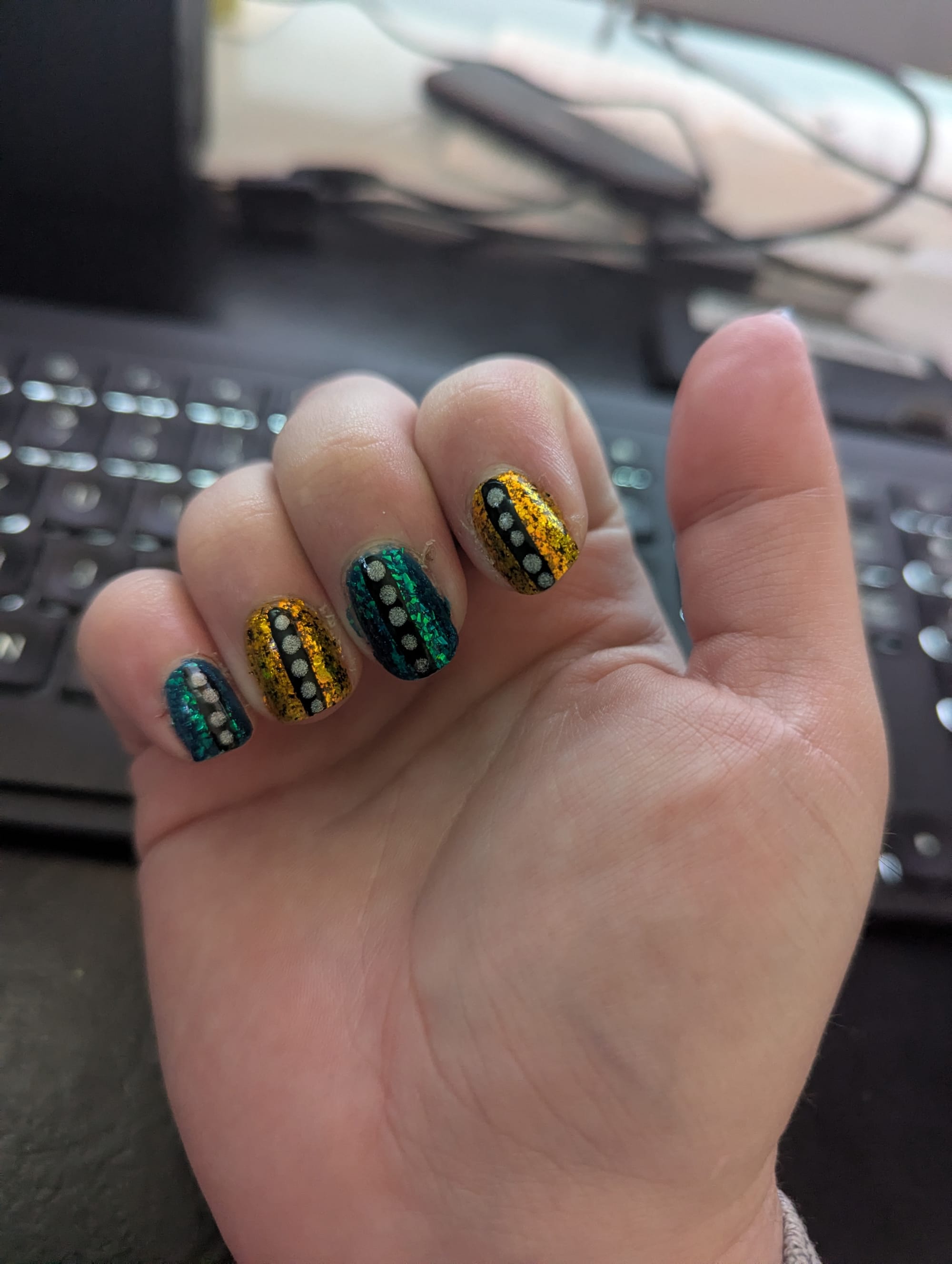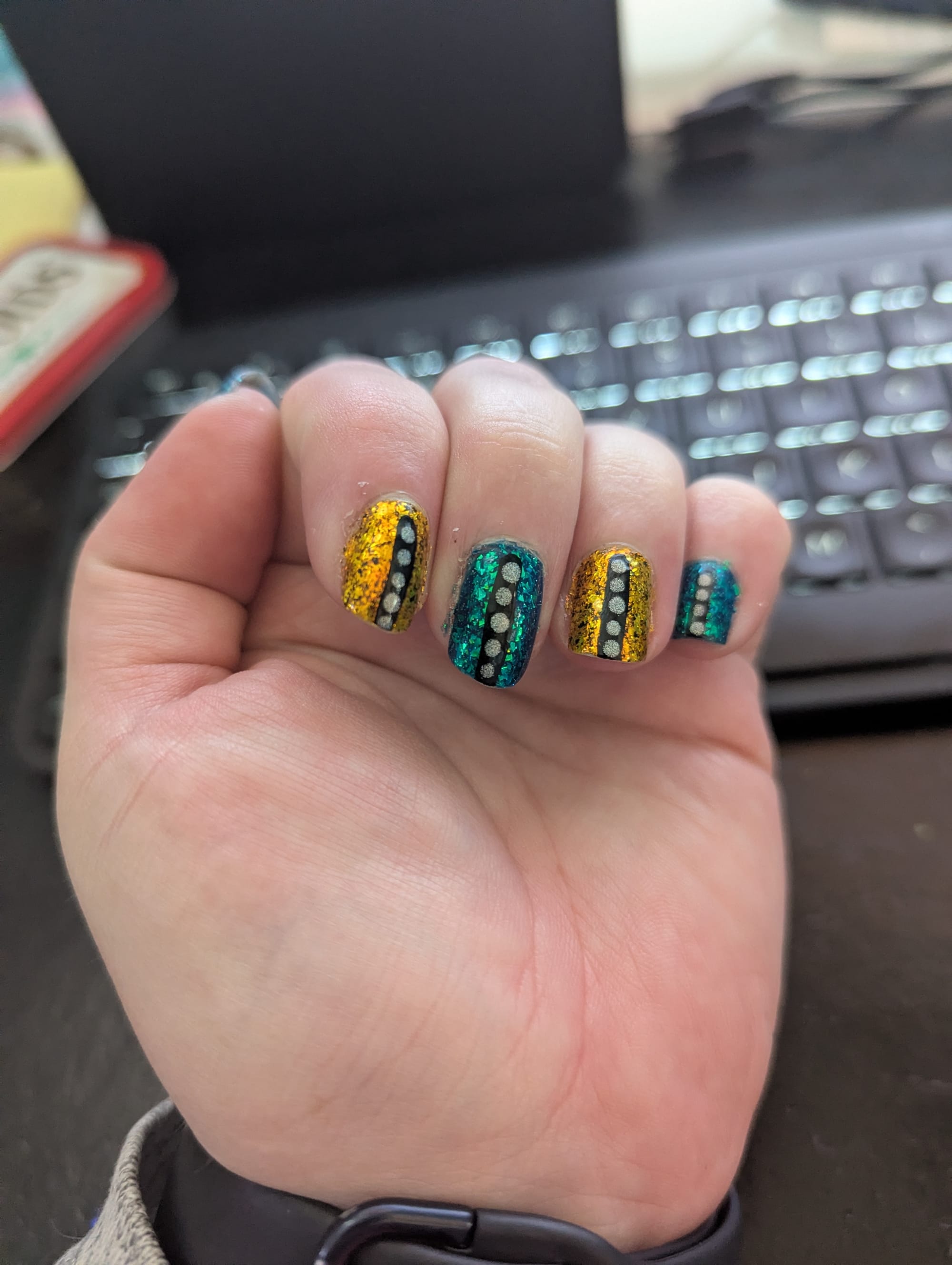 You made it to the end of the newsletter, and that means you get to see this week's nails! I went with high contrast and glittery this week, mainly because I really like the yellow/gold glitter polish with the black flecks and I wanted to keep finding excuses to use it 🤣