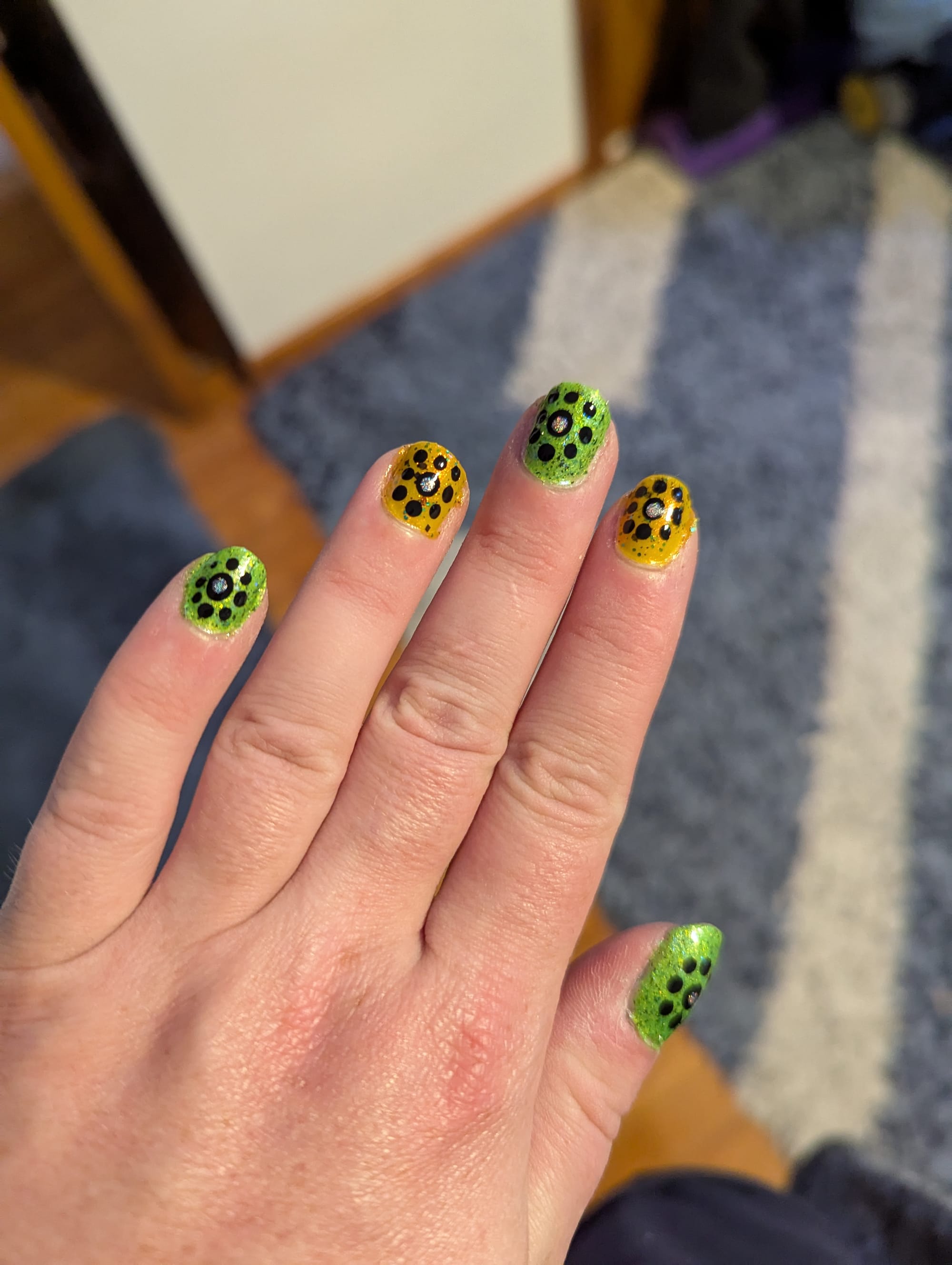 This week's nails are an homage to dandelions, which are just starting their season and are an important part of the foraging calendar. It's true that they aren't as nice as violets when they're picked fresh, but if you stir-fry or saute them, the bitterness breaks down and they get quite tasty. Plus, they are one of those plants that is absolutely impossible to overharvest.