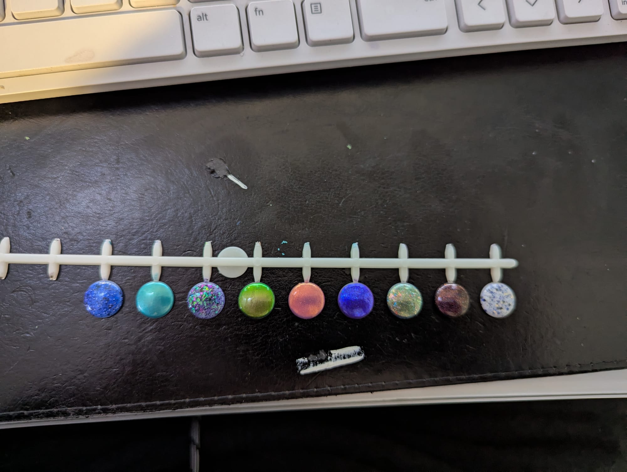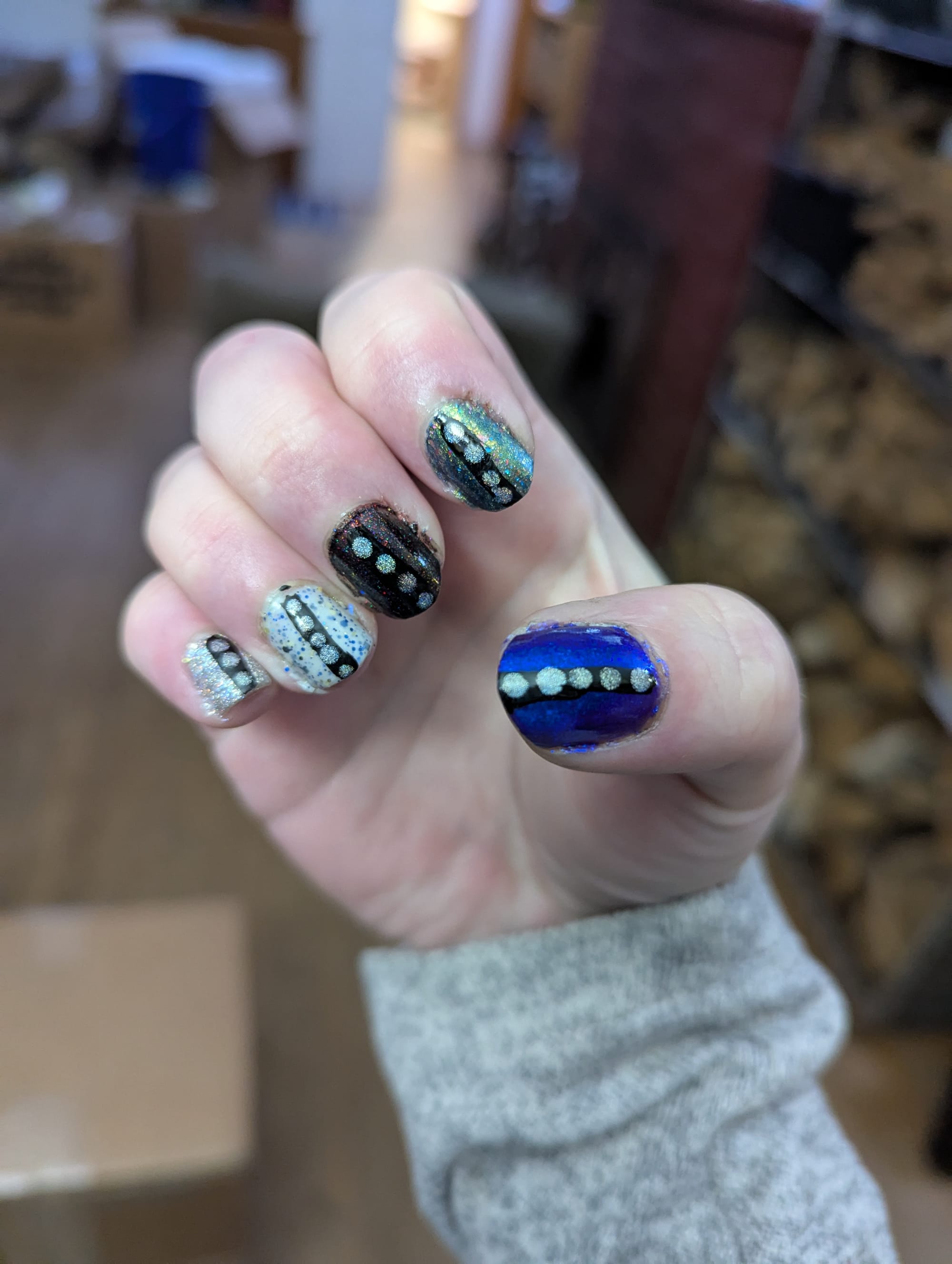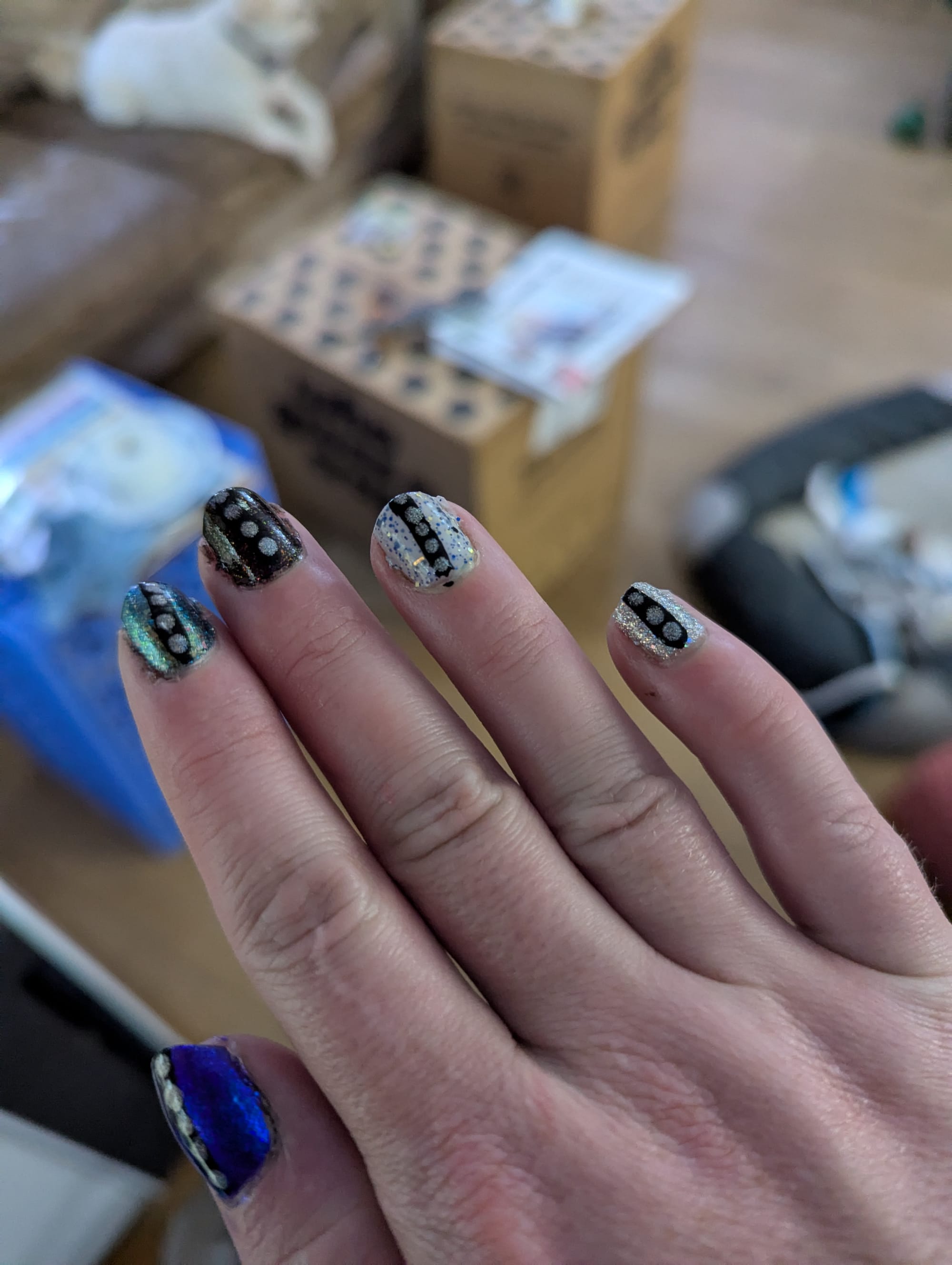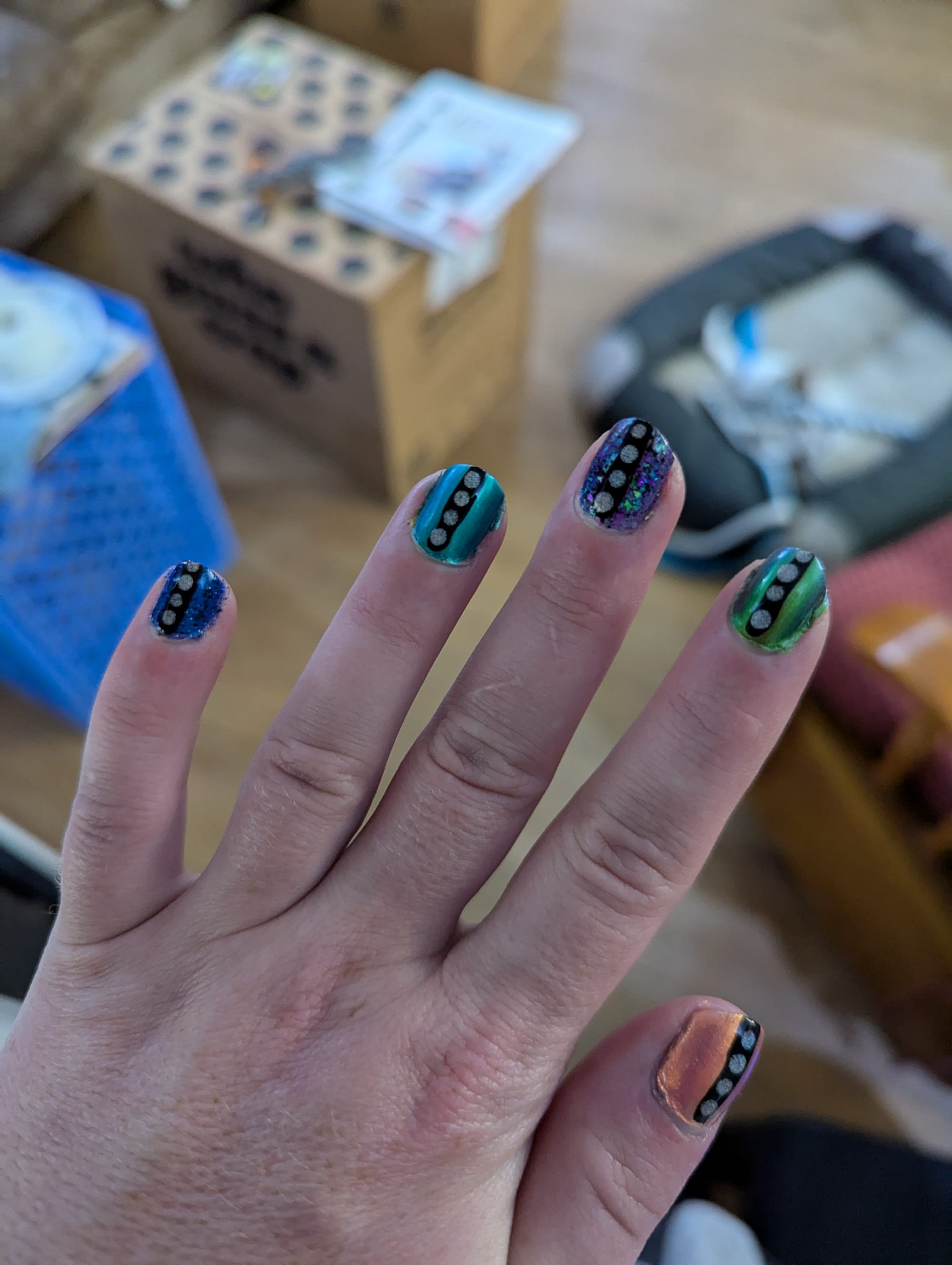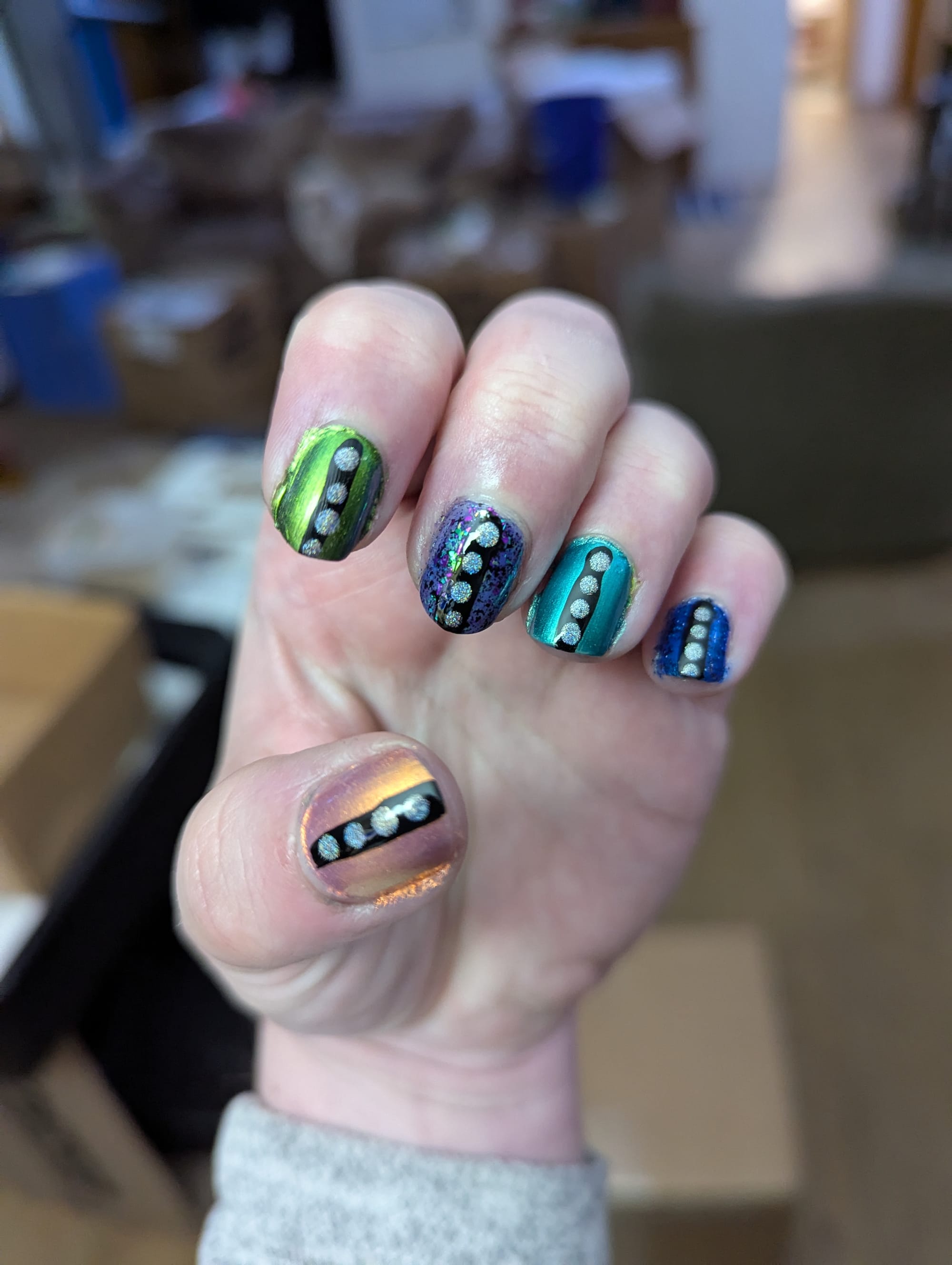 You've reached the end of the newsletter, and that means you get to see this week's nails! For new subscribers, I usually type this newsletter up while I'm doing my nails for the week and waiting for various coats of nail polish to dry. Right now I'm on week 3 of a swatching project, where I'm painting little sample dots with each color of nail polish that I own so that I can stick them on the bottle caps and have a better sense of what each one actually looks like when I'm choosing my polishes for the week. To break it up into more manageable chunks, I've been doing 10 per week and giving myself a multicolor "skittle" manicure at the same time. At this rate, I'll have everything swatched in three or four months. (And yes, I do own entirely too much nail polish. But every town should have a strategic sparkliness reserve ✨)