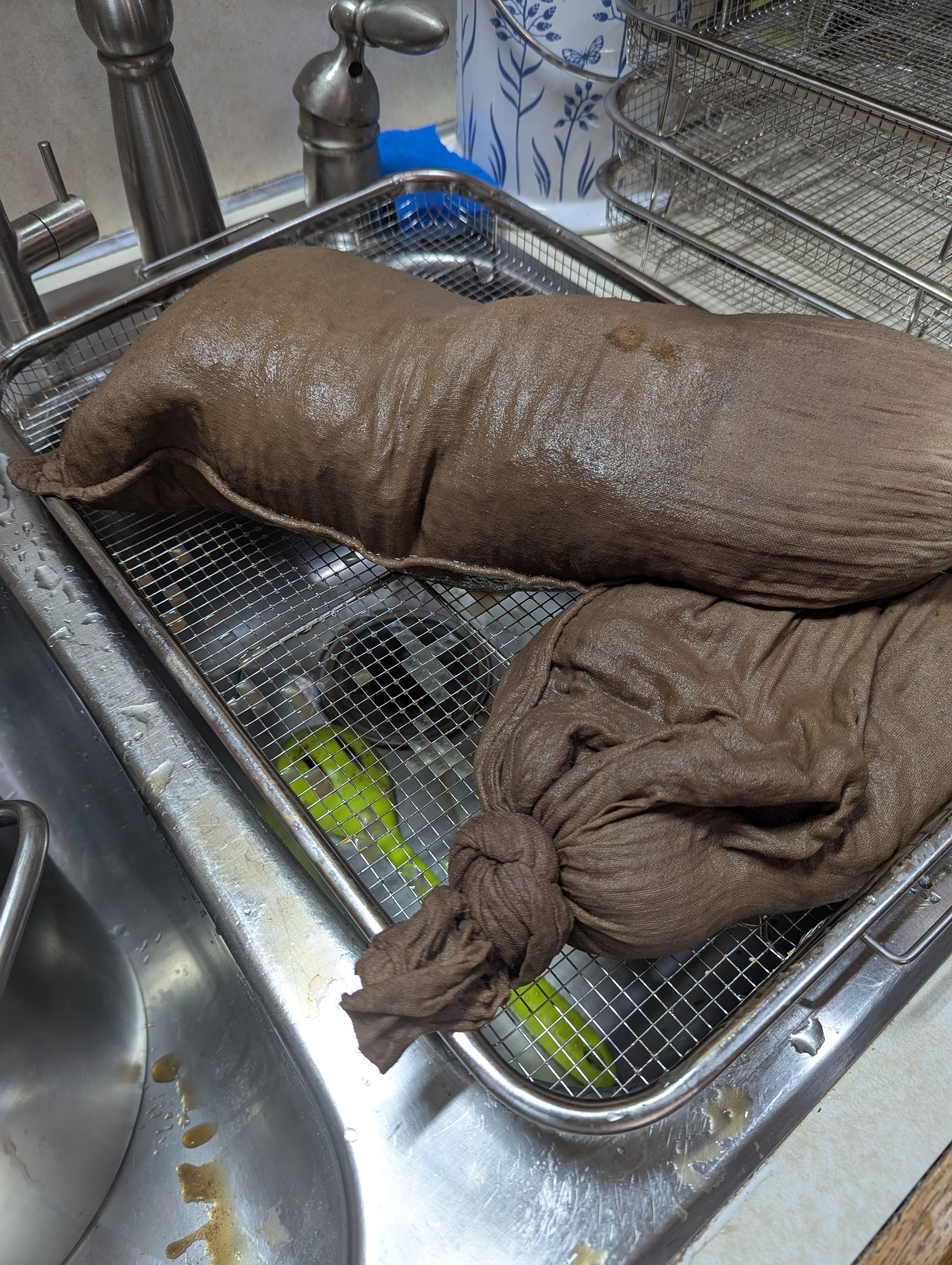 I decided to give hot leaching, where you boil the acorns in a series of waterbaths, a try this week, just in case there were hidden advantages I wasn't aware of. It confirmed my preference for cold leaching. The acorn bits quickly turned into a big slimy mush inside their bags, and I've had a lot of trouble getting that mush dried back out again so we can grind it into flour. It did get a lot of tannins out quickly, but I'd rather leach slowly and dry quickly than the other way around.