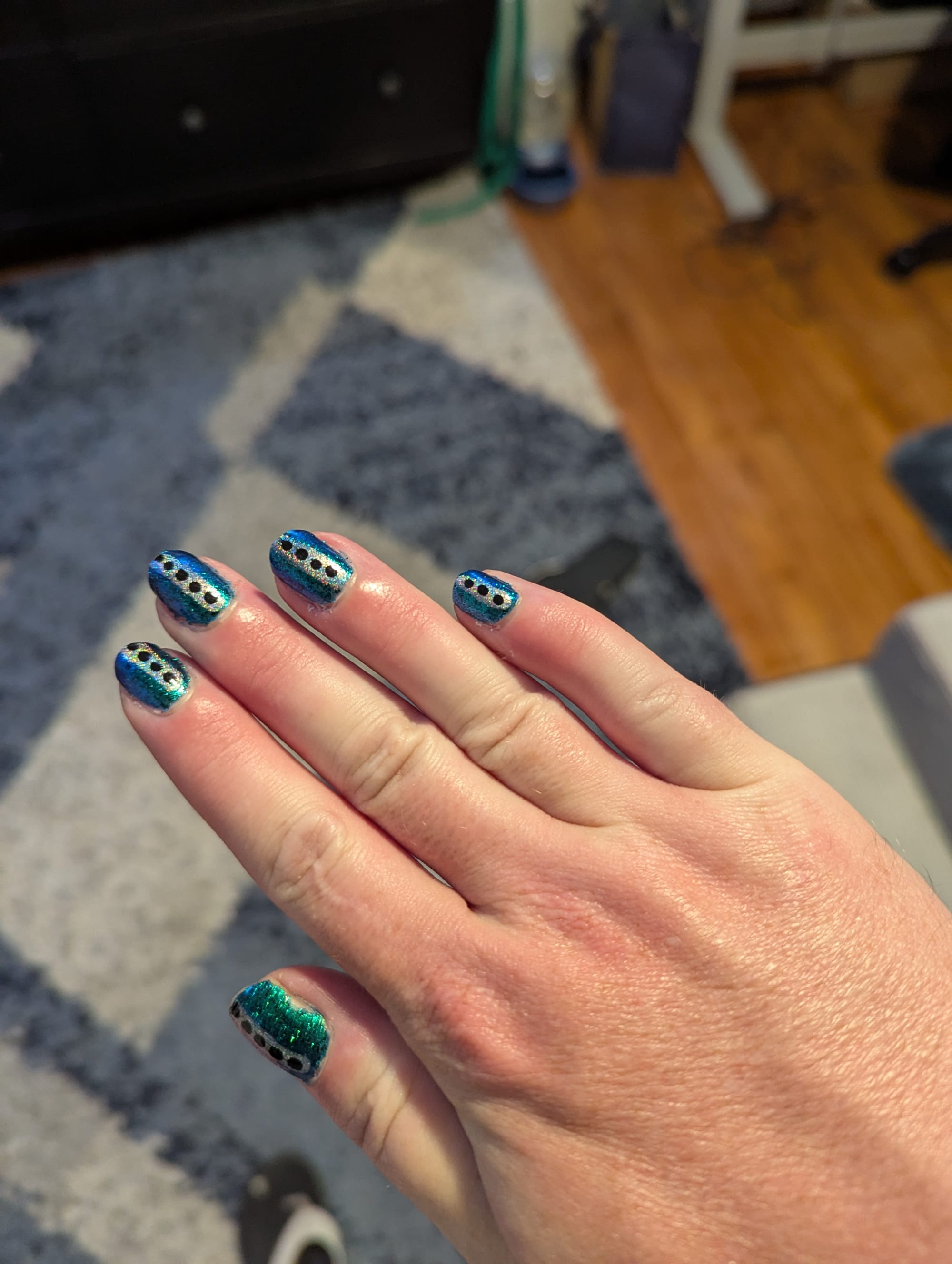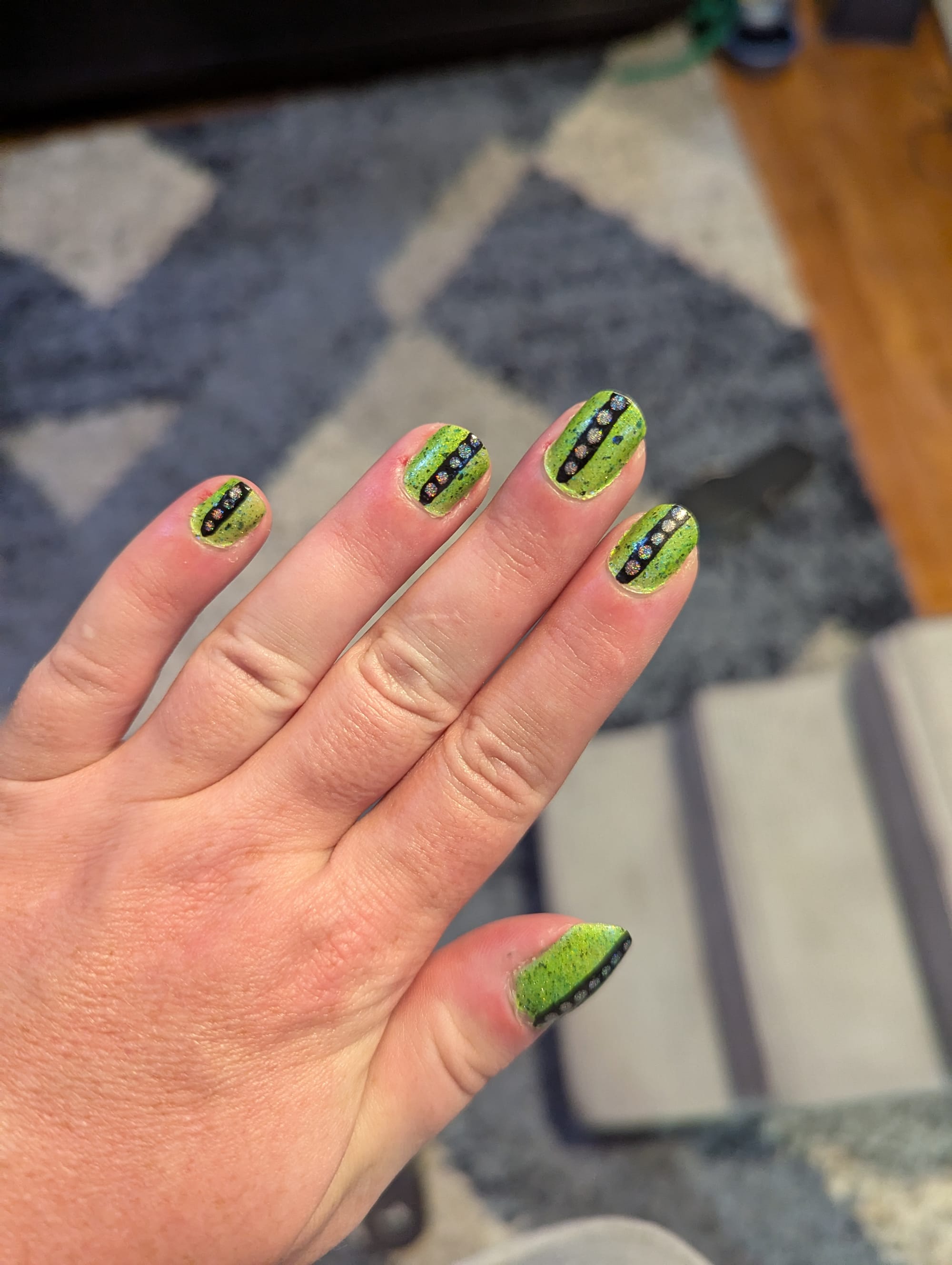 You made it to the end of the newsletter, so that means you get to see this week's nails! For newcomers: I generally write up the newsletter while I'm doing my nails each week, since there's a lot of waiting around for layers of polish to dry and typing is unlikely to cause any smudges. I include pictures at the end of each newsletter as a treat for anyone who actually reads to the end. (Or for nail polish enthusiasts who scroll to the end, I suppose. I'm not the boss of you 😉)