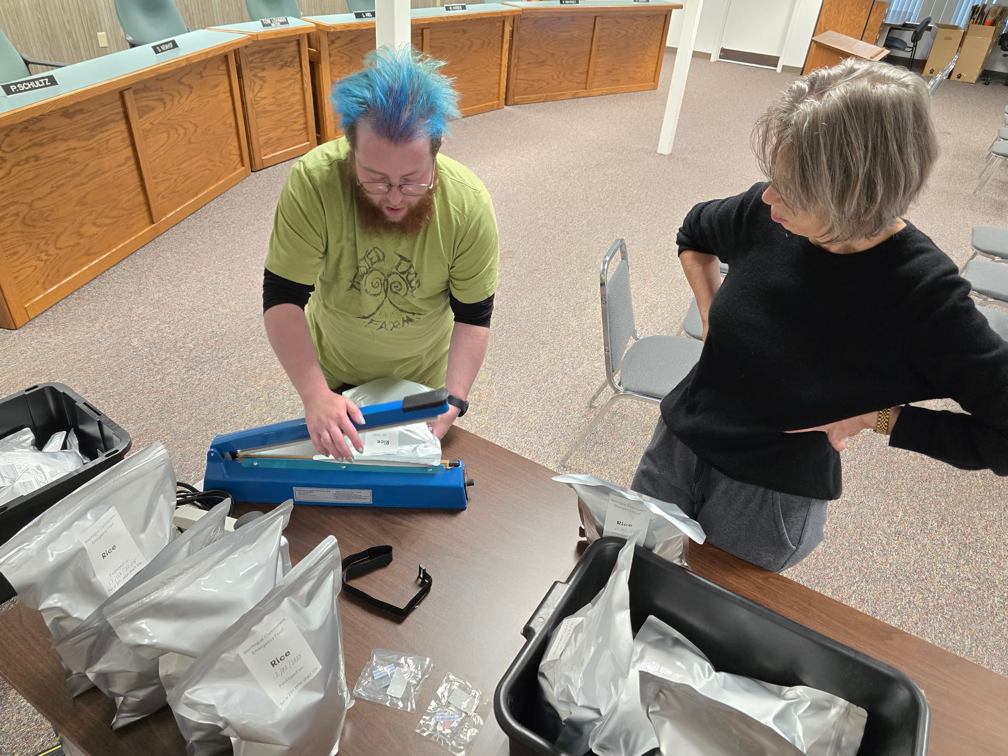 Once we have ten filled bags lined up, it's time for the oxygen absorbers. They come in sealed packs of ten, and they start doing their thing as soon as the seal on the pack is broken. So everybody stops their other tasks, joins in on the official "3...2...1... Oxygen Absorbers!" chant, and races to get the bags zipped closed as quickly as possible once the oxygen absorber goes in. This is one of the steps that makes this MUCH easier as a community project than it would be to do this at home by yourself.