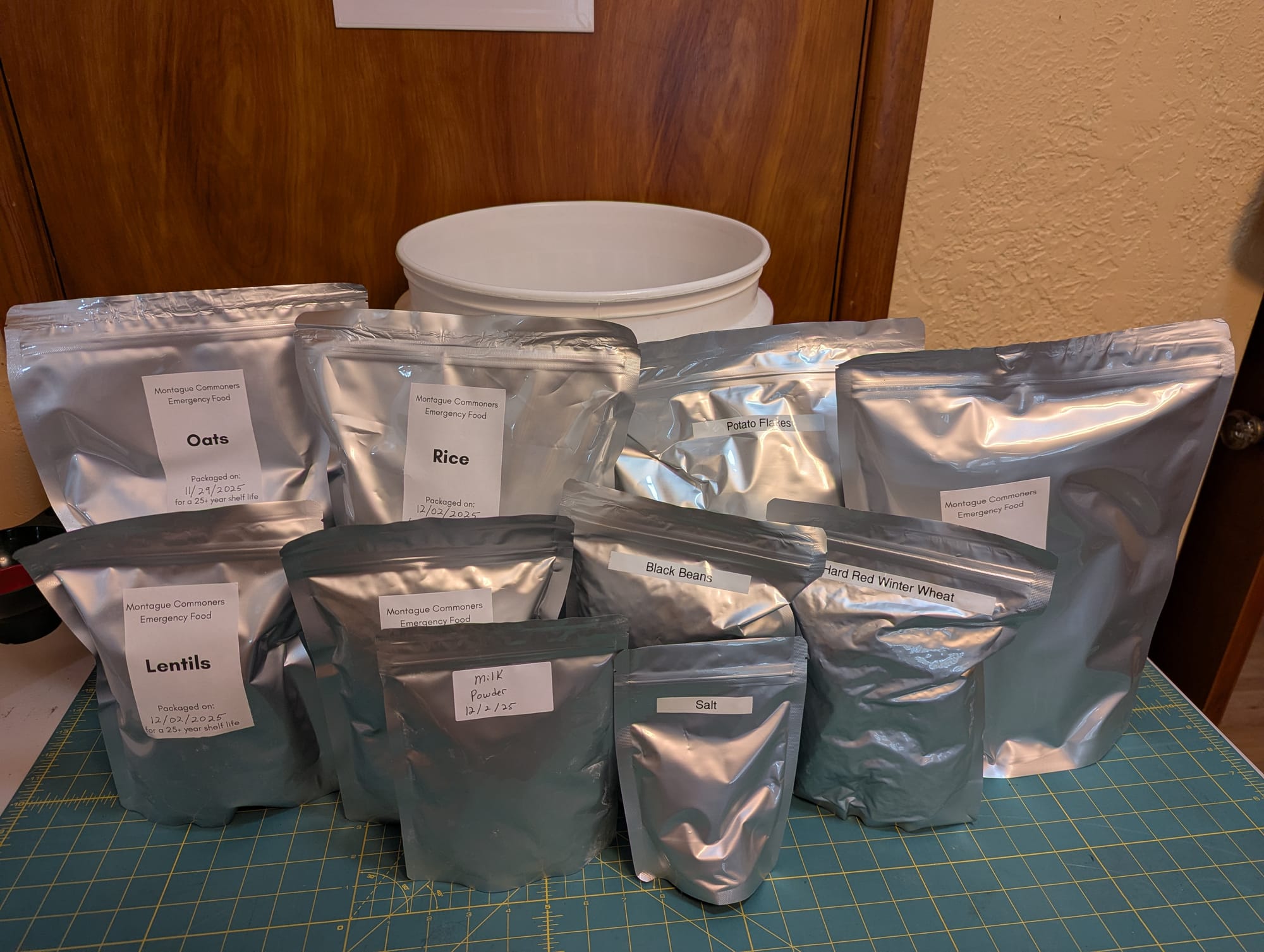 One of the big challenges of this project turned out to be getting all of the different bags to physically fit in the bucket. There are 11 bags in all (the sugar is missing from the picture above), and things like the oats and potato flakes are quite bulky for their weight. For a while, I was worried that we were going to have to split things between two buckets, and keep track of which buckets were which. Luckily, Josh Davis figured out the right combination of folding, arranging, and squishing to get everything to actually fit. 🥳 We were able to replicate his results and got the lids to close on all 50 buckets eventually.