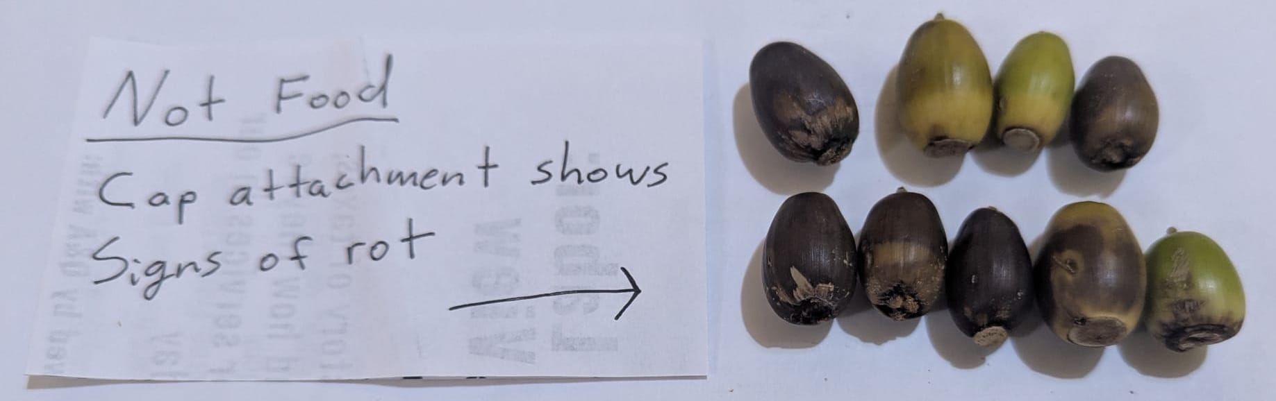 Here are some examples of acorns with rotten or missing cap attachment pads. The pad is often softer or weaker than the rest of the shell, so it tends to be the first place attacked by mold or squirrels.
