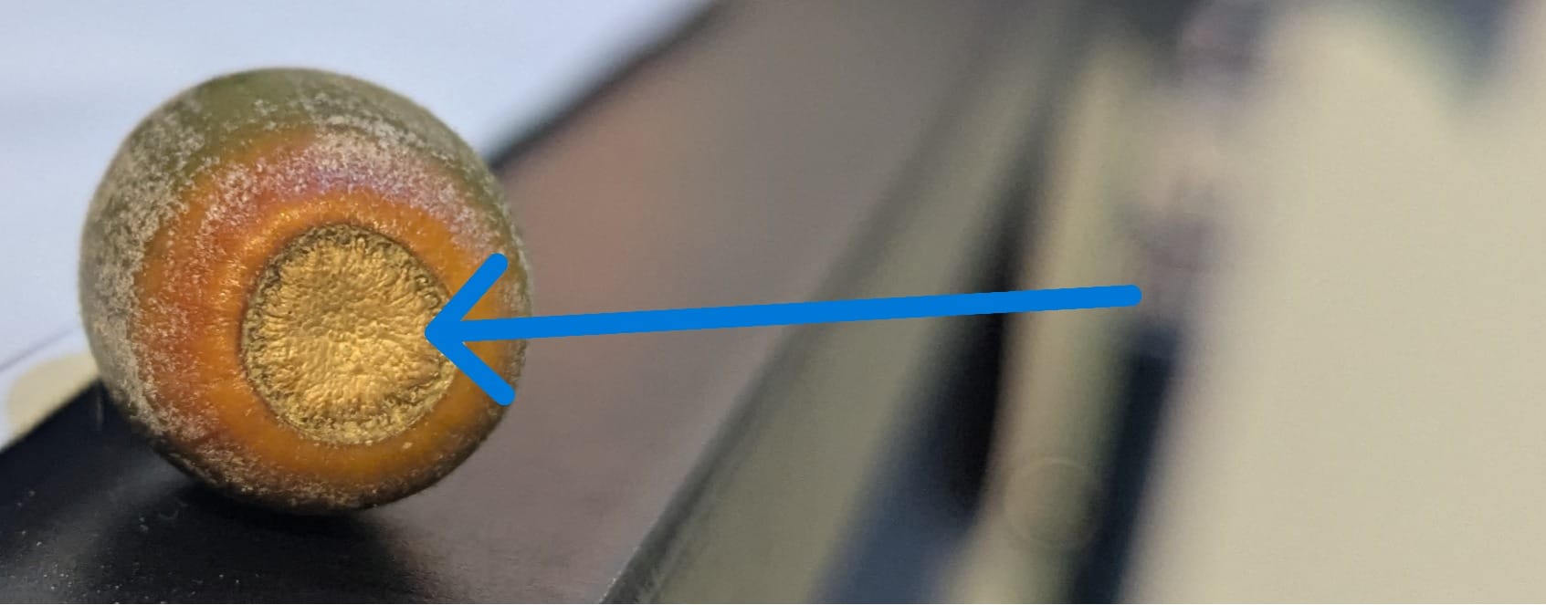 Here are some examples of acorns with rotten or missing cap attachment pads. The pad is often softer or weaker than the rest of the shell, so it tends to be the first place attacked by mold or squirrels.