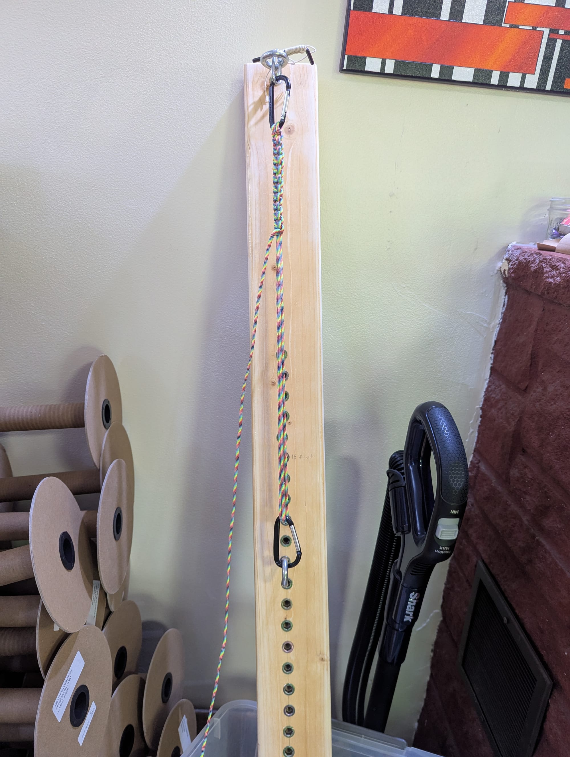 When I first started making baskets, I made the handles by attaching the clips to the wire shelves of the firewood rack in my living room and running the paracord between them. It worked well as a proof of concept, but the handle lengths were limited by the configuration of the shelves, and even I can get sick of staring at firewood eventually 😉