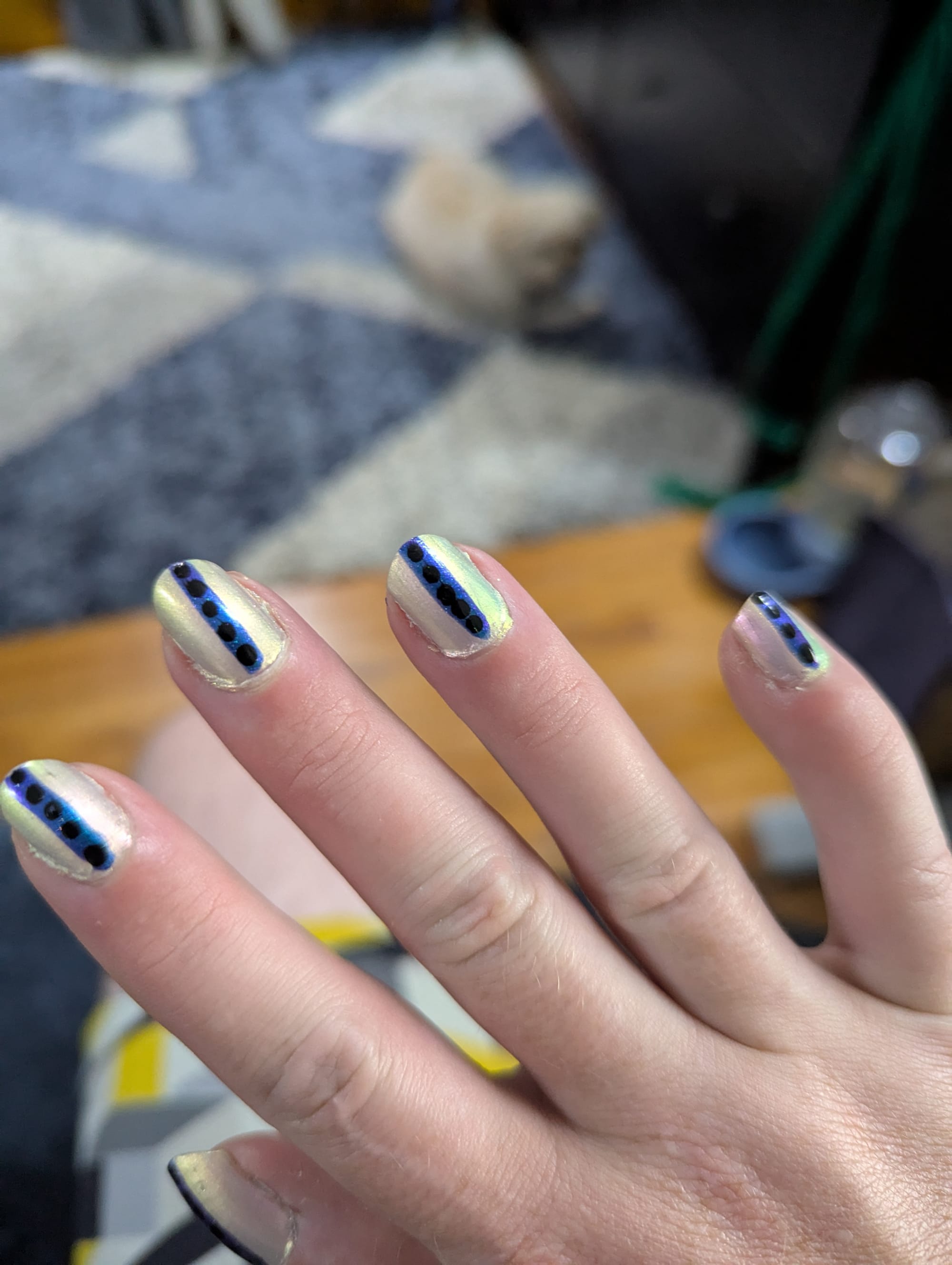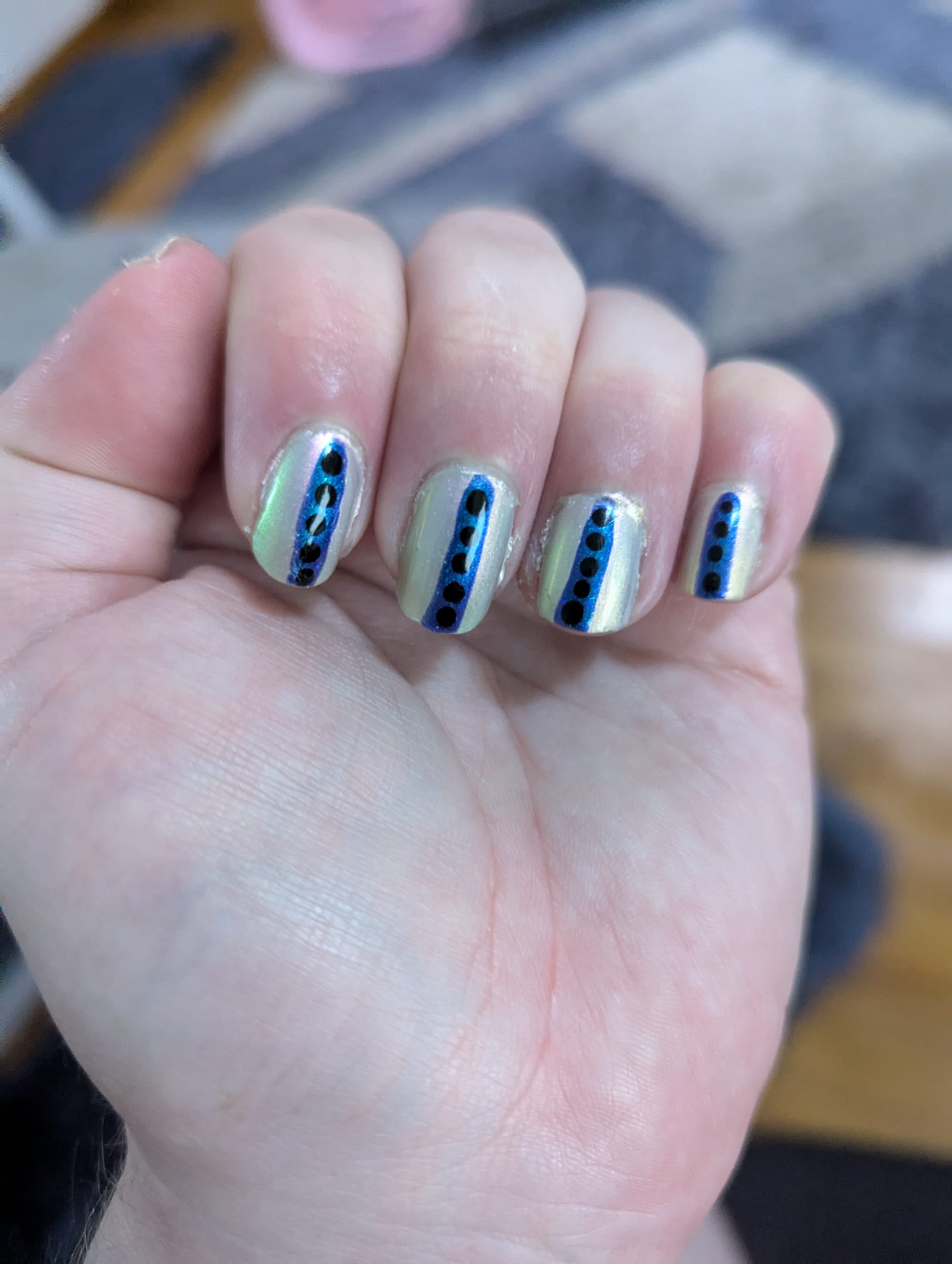 You made it to the end of the newsletter, and that means you get to see this week's nails! I kept it fairly simple this week, though the "white" background polish has a multi-chrome shimmer effect that ranges from pink to green depending on lighting conditions.