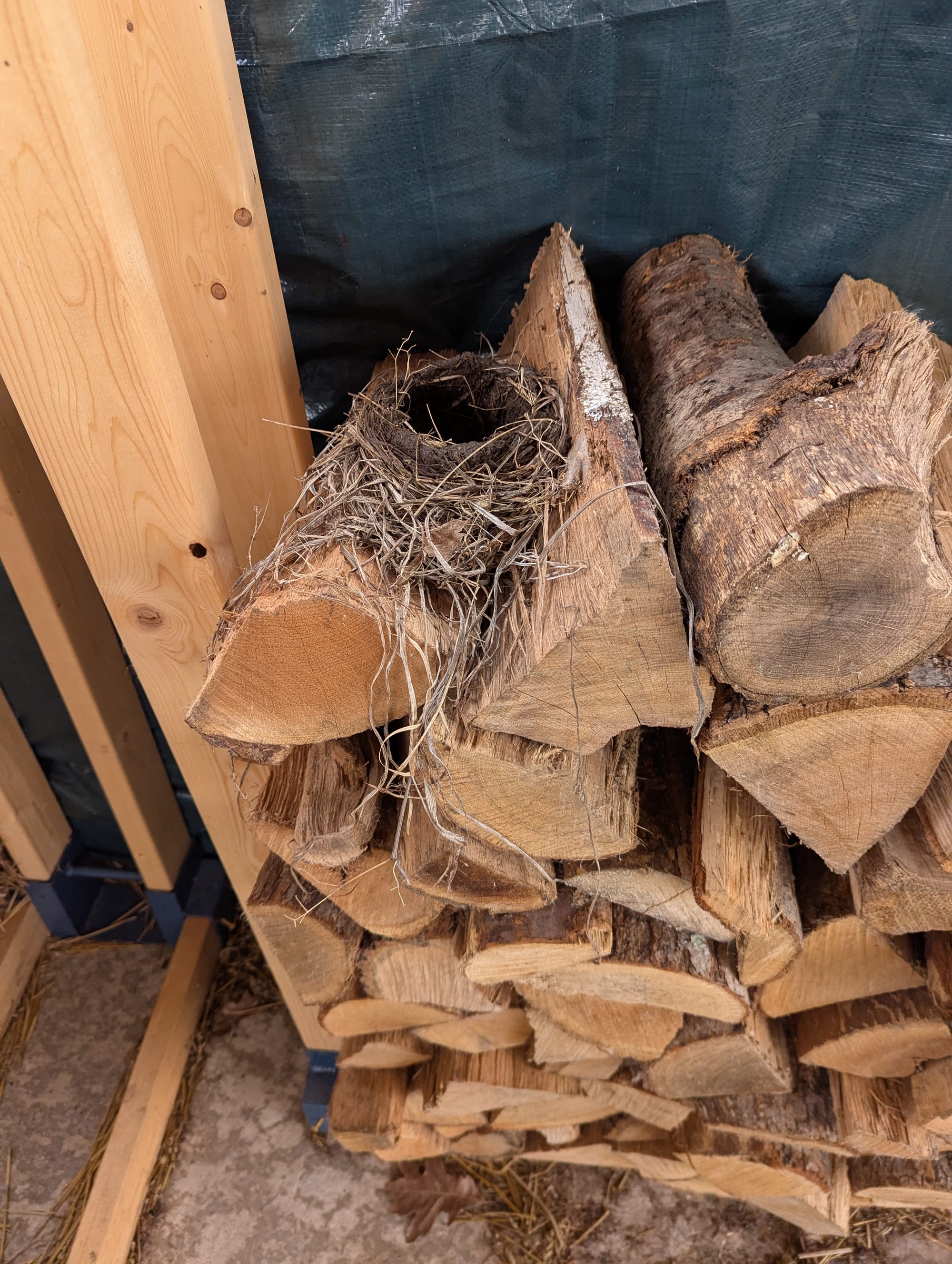 The only detractors we faced yesterday were a pair of robins who thought they'd found a perfect spot for a nest on top of the one remaining woodpile, and were very disconcerted to have a bunch of giant monkeys show up and ruin the vibe. After we were finished with cleanup we did our best to gently move the nest to a table where they might be able to raise their eggs without getting disturbed when we move the woodpile. Nate's pretty sure that the nest wasn't there on Friday when he was moving the firebricks, so hopefully if they don't like their new table-based digs, they've still got time to build something new in a spot where the giant monkeys won't bother them. Either way, it was great to be able to watch them at work, and I was very impressed by their nest-building abilities.